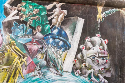 We got back from Potsdam in the mid afternoon, took a little break in the hotel room, then headed out to do the Communist East Berlin Walk which took us to another large section of the wall that has had various artists paint murals on each section. What we weren’t expecting was the throng of young adults who were taking pleasure in the May Day celebration. There were thousands of empty beer bottles and their accompanying caps strewn all over everywhere!! It was quite a party.